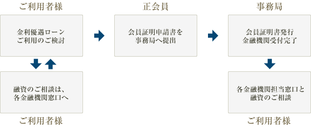 本優遇ローンをご利用いただくためには、所定の条件を満たした上で、当協会正会員を通じて当協会事務局までお申込みいただくことが必要となります。